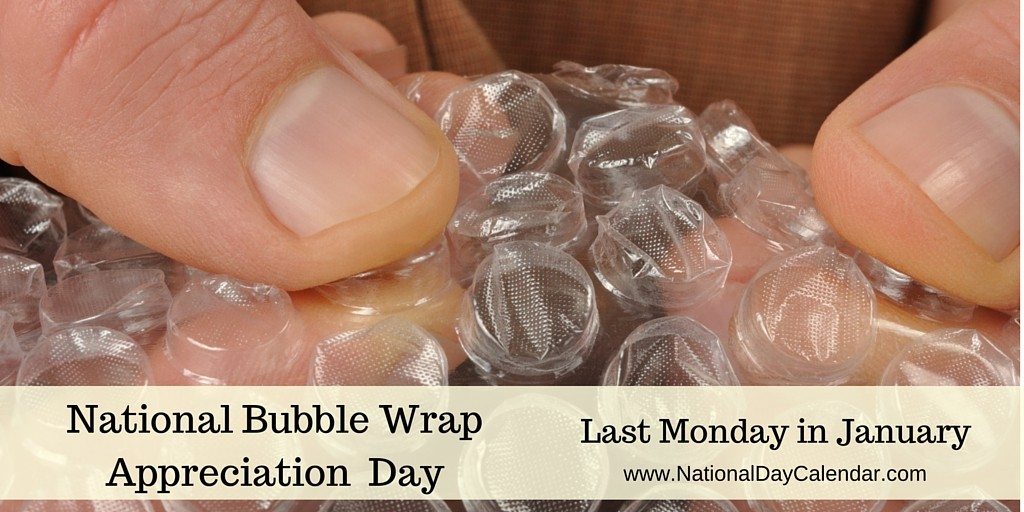 It’s National Bubble Wrap Appreciation Day. Have you ever thought about how it came to be? The calendar tells us: Engineers Marc Chavannes and Alfred Fielding sealed two shower curtains together in 1956 in the town of Hawthorne, New Jersey.  This technique created a smattering of air bubbles which the engineers initially thought would make a great wallpaper!  Sales for the wallpaper never materialized, so they moved to selling the product as greenhouse insulation. (Can you imagine it as wallpaper? Not!)