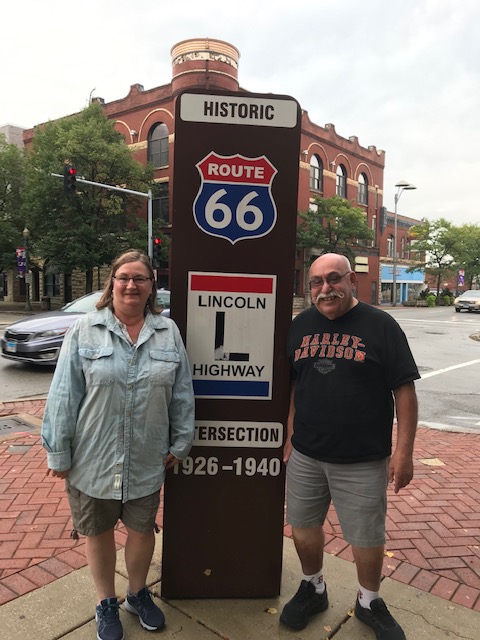 So much of 66 in this area is buried under Rt. 40, not driveable anymore, or inaccessible on Native American lands, but going through Winslow, Arizona, the route is alive and well for a few miles. We guess it is probably the most famous corner of the whole route because of the Eagles song, Take It Easy, which mentions standing on the corner. Some guys that had just arrived on their Harley’s took this picture for us. Everyone was very friendly and having a good time. The eagle on the window sill and the couple seen above us are paintings. Really good ones.
